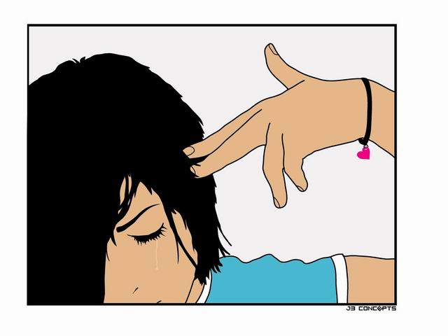 * Наклонить голову, чтобы свисала чёлка, и приставить к виску два пальца на манер пистолета.