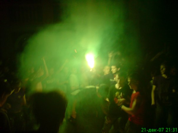 Действо началось с попозданием минут на 5-10, т.е. можно считать без него. Начали живо, с песни "Иди в отмах" (слушать всем!), и обороты не сбавляли. где-то после 3й песни состоялся 1й разговор Тэма с охранниками. Надо сказать, что охранники в 9 вале -- МУДАКИ! Жаль, матом ругаться нельзя. Дальше был снова движняк. Где-то тогда мне заехали по уху, что в итоге вылилось в порванную кожу над дыркой (всё ухо в крови было). В один момент один из охранников начал толкать народ, на пол упала девушка, на неё упал я, на меня ещё кто-то. Вобщем п**дец.